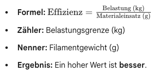 Interpretation: Brücke B ist effizienter, da jedes Gramm Material mehr „Arbeit“ leistet.